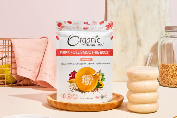 The delicious fiber fuel smoothie boost from Organic Traditions has been shown to provide long-lasting energy, promote regularity and support your digestive health – goodbye unfriendly bloating.